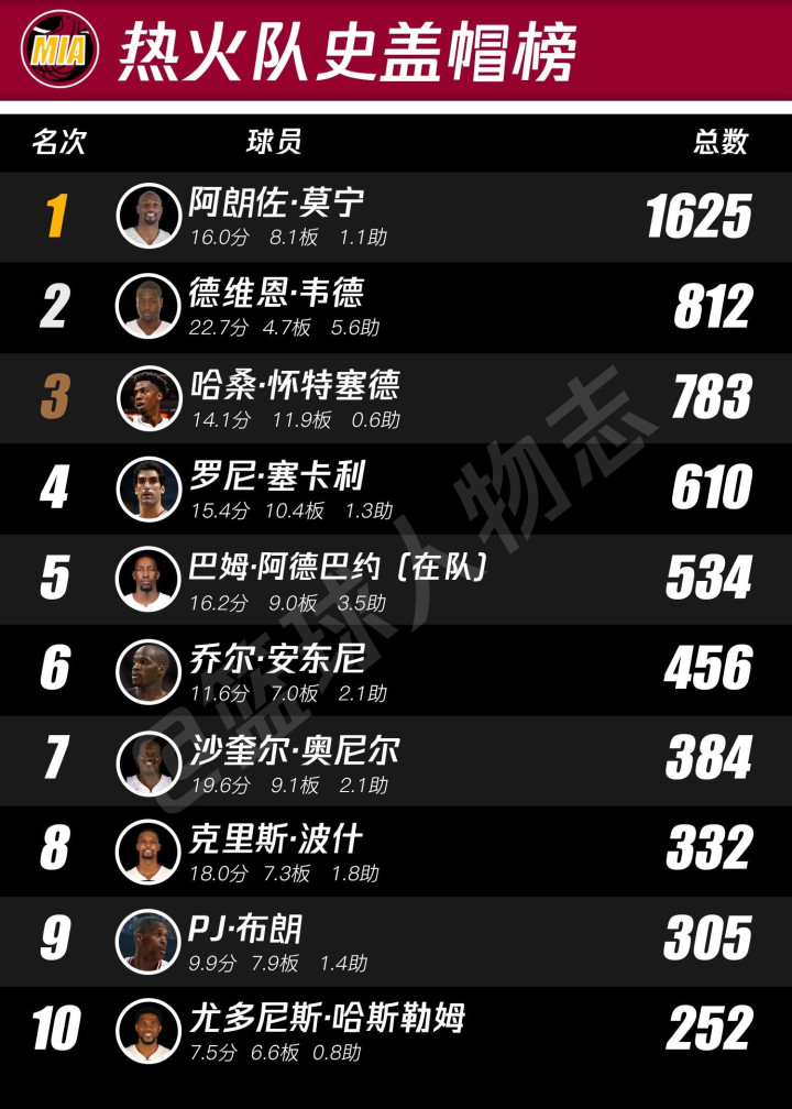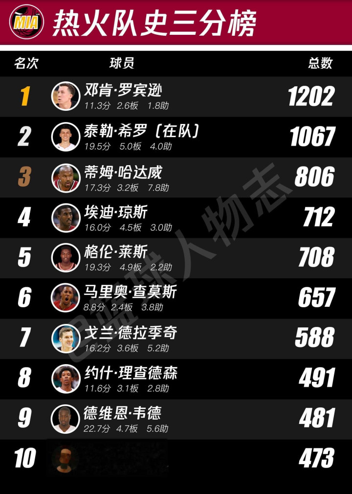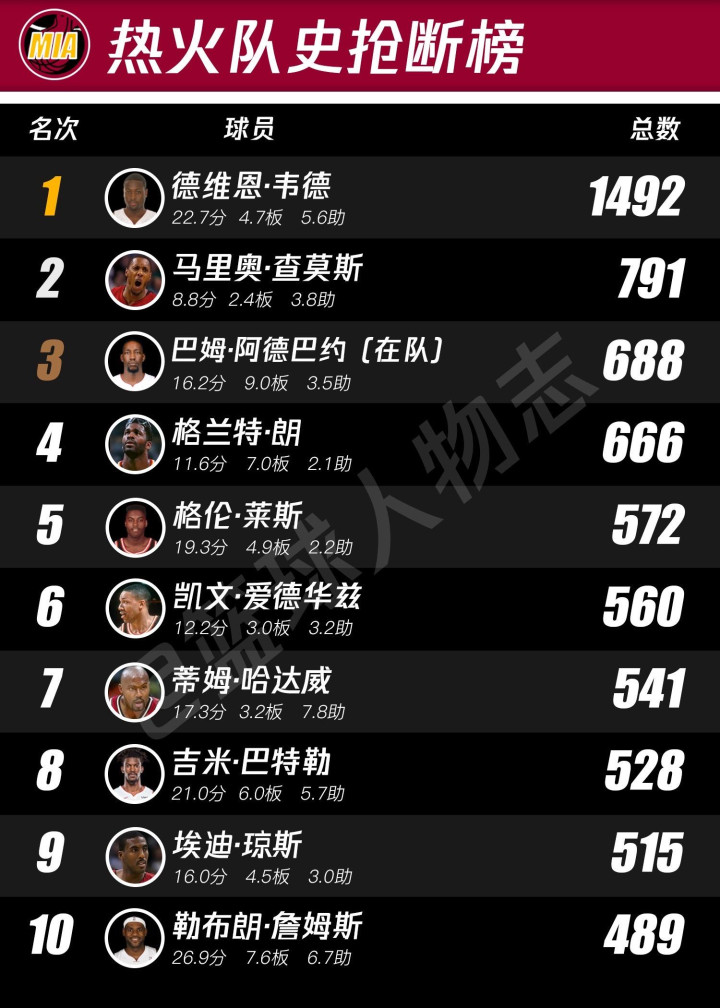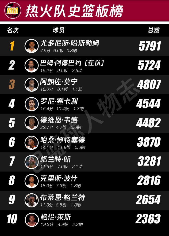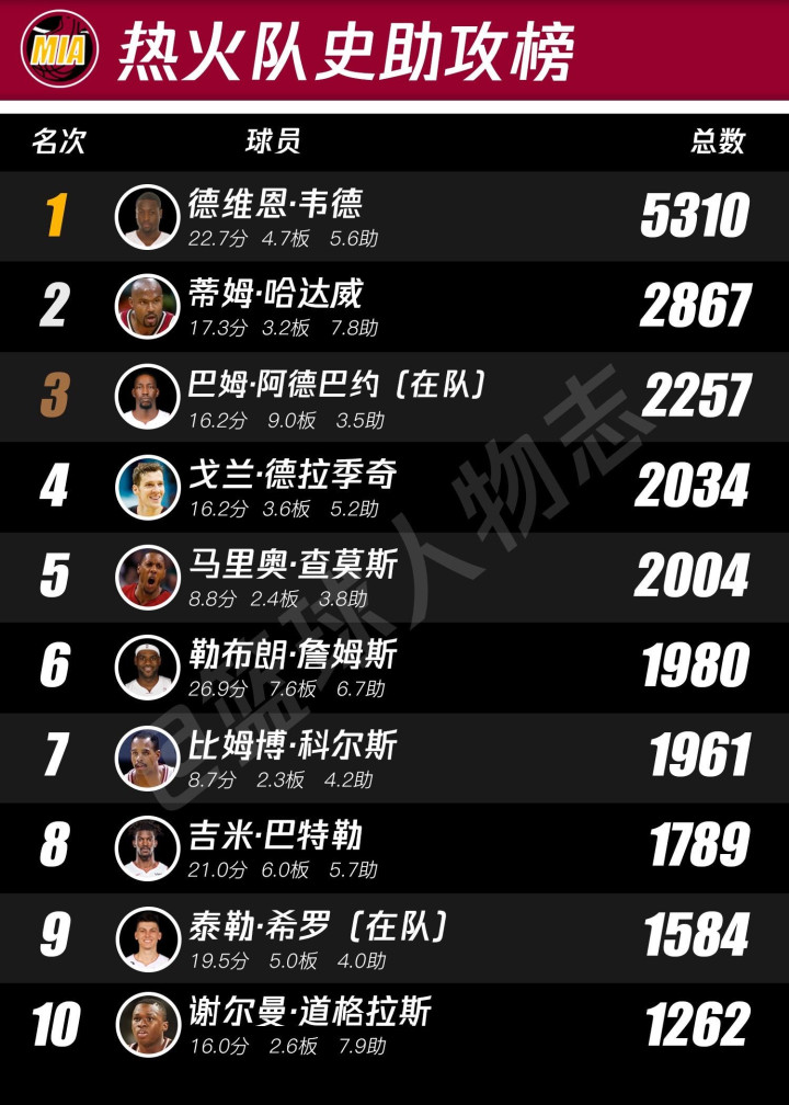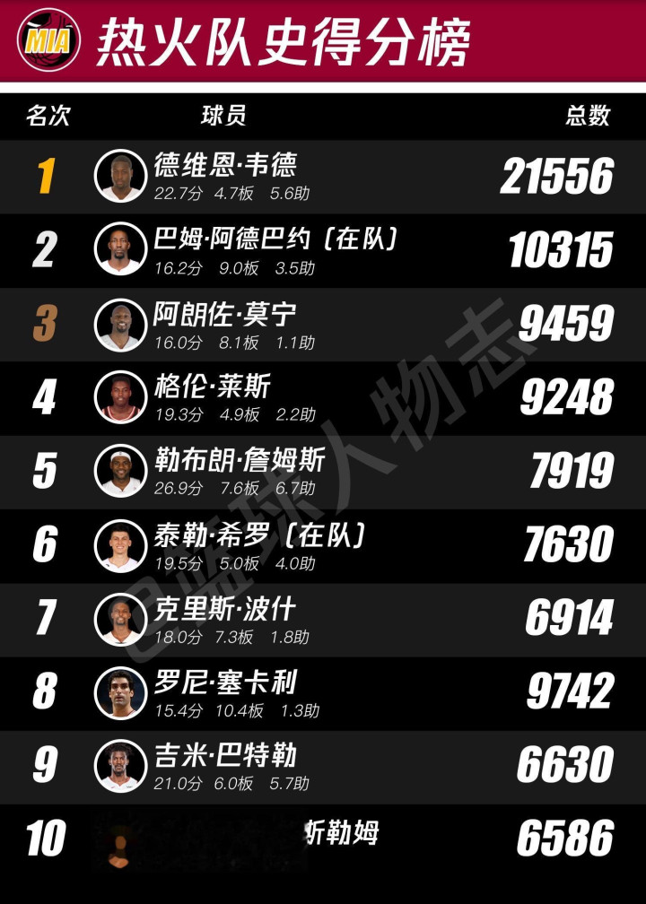 热火队史排行榜。看了这个你就知道帕特莱利有多对不起韦德