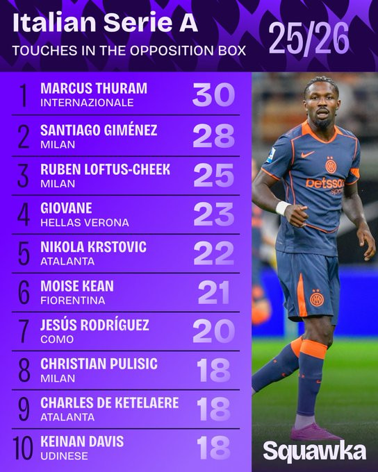 虎扑09月25日讯Squawka数据统计本赛季意甲对方禁区触球榜,马库斯-图拉姆30次排名第一。